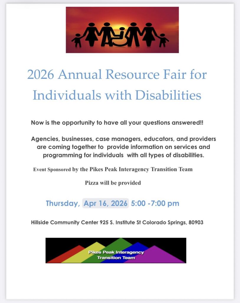 2026 Annual Resource Fair for Individuals with Disabilities April 7, 2026 by admin We are proud to be a part of 2026 Annual Resource Fair for Individuals with Disabilities. This event is Hosted by Pikes Peak Interagency Transition Team (PPITT) and takes place on April 16th from 5pm to 7pm in Colorado Springs. Join us!